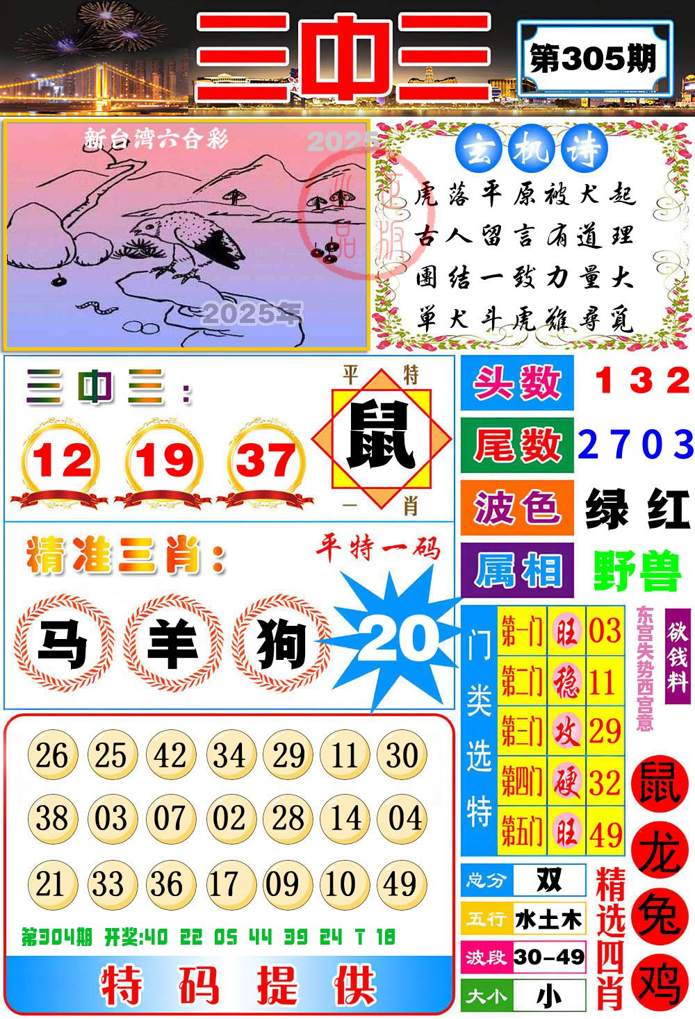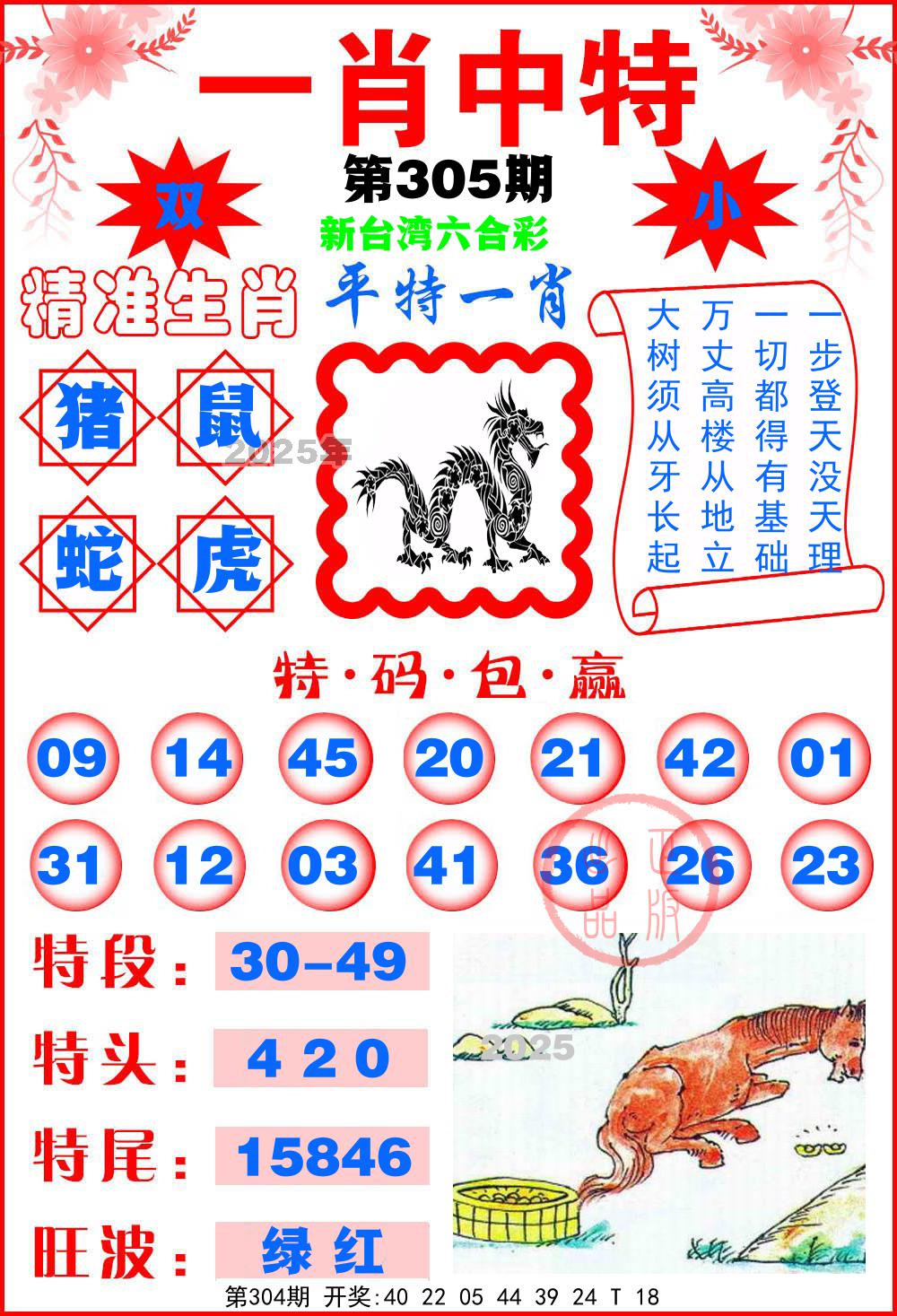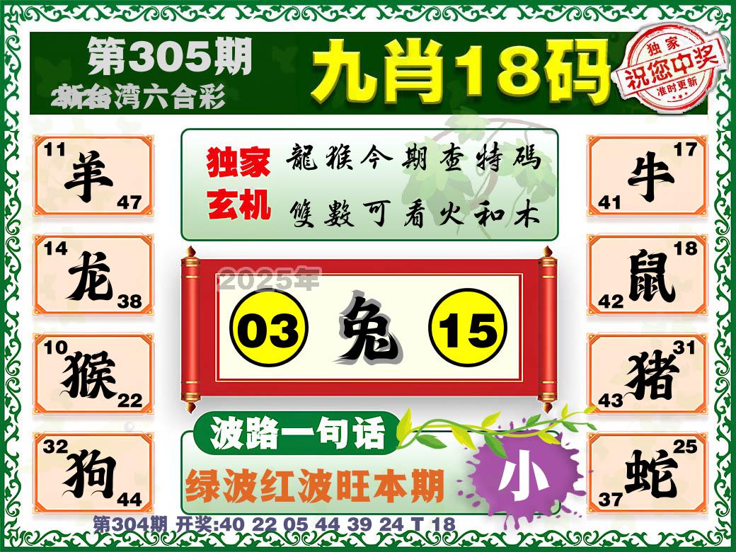 | 2025304期:九肖 | 虎蛇马猴羊鸡龙鼠牛 | 开:18鼠 |